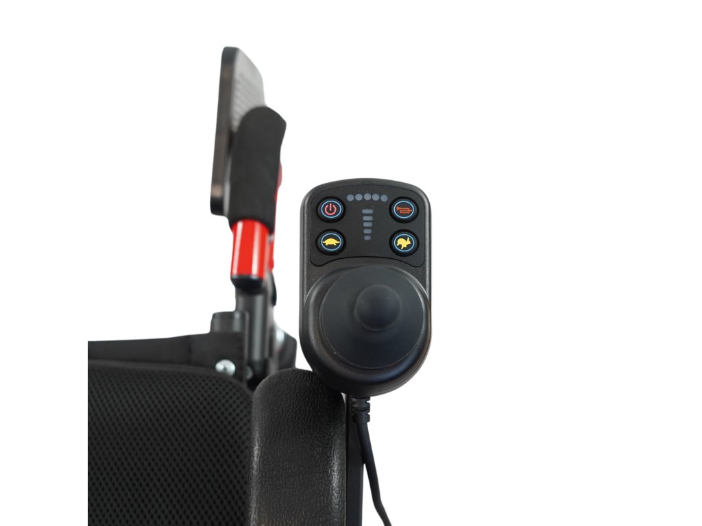 Su joystick reducido garantiza a los usuarios pequeños un fácil manejo y fomenta la independencia y la seguridad durante la conducción. Las guías laterales de la silla de ruedas están estratégicamente integradas para evitar movimientos indeseados y garantizar la estabilidad y la seguridad durante su uso. Gracias a su asiento de 38 cm de ancho, perfectamente adaptado a los niños, la silla ofrece un asiento cómodo y con buen apoyo que garantiza la comodidad incluso durante un uso prolongado.