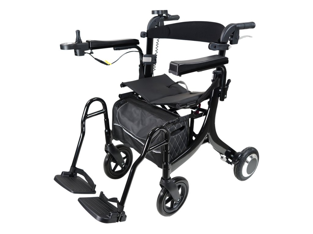 La silla de ruedas eléctrica está propulsada por dos potentes motores eléctricos, que también se utilizan en trenes de alta velocidad. Tiene cinco velocidades y se controla pulsando los botones + y –. Puede alcanzar una velocidad de hasta 6 km por hora, ajustar la velocidad con una palanca, controlar la silla de ruedas con la mano derecha o la izquierda y frenar rápidamente gracias a los frenos electromagnéticos inteligentes. La silla es lo suficientemente potente como para aguantar todo el día de uso. Además, siempre puede cambiar al modo manual. Se carga durante la noche en 6 a 8 horas.
