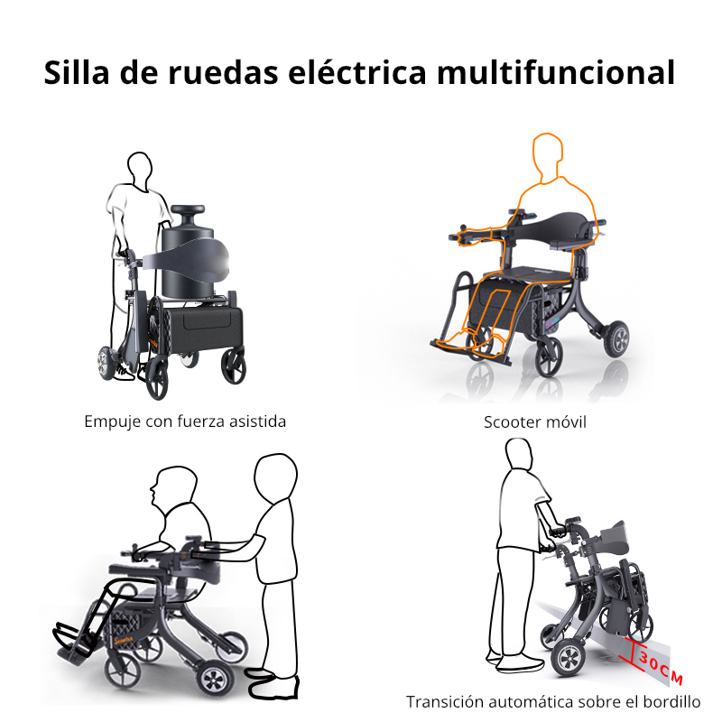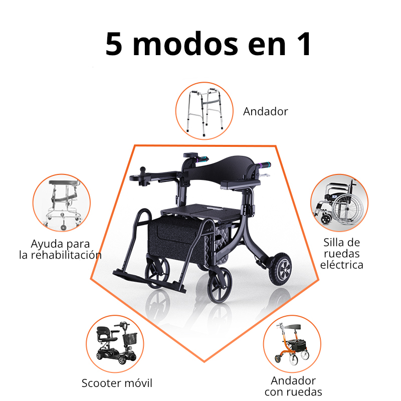 La silla de ruedas eléctrica 9000SW es excepcional gracias a sus 5 funciones. La Eroute 9000SW se puede utilizar como andador, andador con ruedas, silla de ruedas, scooter móvil o asistente de rehabilitación.