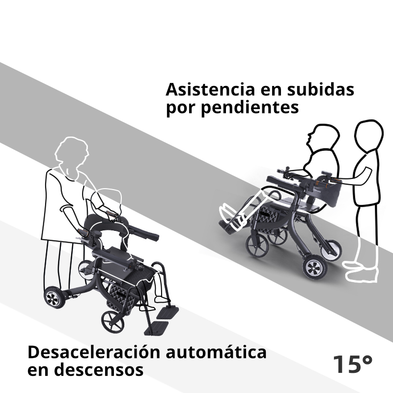 La silla de ruedas se puede configurar en modo asistente de rehabilitación. En ese momento, el andador genera resistencia, lo que resulta beneficioso para las personas mayores que realizan ejercicios de rehabilitación. Los apoyabrazos ajustables, anchos, suaves y ergonómicos alivian la columna vertebral. El cómodo y ancho asiento de espuma de alta resistencia y los amortiguadores delanteros y traseros le proporcionarán comodidad en cualquier terreno. Además, cuenta con una función anticaída. Si de repente pierde el equilibrio y existe riesgo de caída hacia delante, el sistema bloquea el andador mediante detección automática, de modo que el andador ya no se mueve hacia delante, lo que garantiza su seguridad.